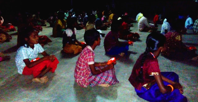 பொழுது சாய்ந்த மாலை நேரத்தில் நாங்கள் சென்றபோது அந்த குழந்தைகள் வரிசை வரிசையாக அமர்ந்து எங்களுக்கு அன்பான வரவேற்பளித்தனர்..அந்த பிஞ்சு உள்ளங்களைப் பார்த்த அந்த கணங்கள் என்ன காரணத்தாலோ எங்கள் மகிழ்வை கலைத்தன. குழந்தைகள் விரும்பிக்கேட்டிருந்த பென்சில் பேனா நோட்டுப்புத்தகங்கள் கிரீம் ரொட்டிகள் கடலைத்துண்டுகள் ஆகியவற்றை எனது மருமகன் பாலகிருஷ்ணன் அனைவருக்கும் வினியோகித்தார். மகிழ்வோடு பெற்றுக்கொண்ட அந்த குழந்தைகள் இன்னும் என்னன்ன வேண்டும் என்பதை உரிமையோடு அவரிடம் கேட்டது எங்களை பெரிதும். மகிழ்வுக்குள்ளாக்கிற்று.